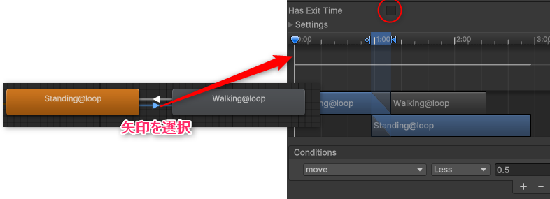 次に矢印を選択し、inspectorから「Has Exit Time」のチェックを外します。このチェックがついているとExit Timeまでアニメーションが変わりません。