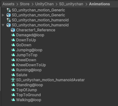 ここにAnimation Clipを入れていくわけです。UnityちゃんにはあらかじめいくつかのAnimation Clipが含まれていますのでそれを利用します。