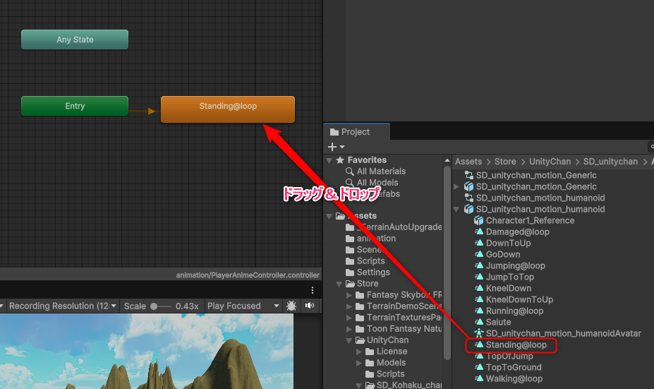 まずは何もしていない(Idle)状態を追加します。この中では、立っているStandingですかね。