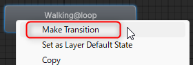 Walkingで右クリック「Make Transition」からStandingにつないで、止まったらStandingに戻る