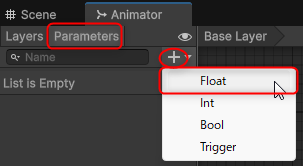 まずがパラメータの作成です。今回の場合、移動になります。移動は移動量があるのでFloatにします。