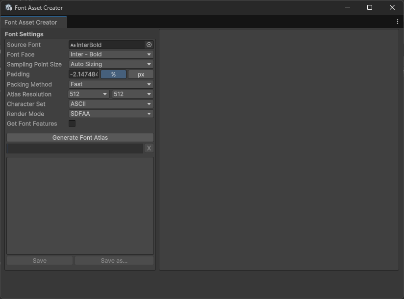 完了したらSaveを押して、作成したフォントアセットを保存します。