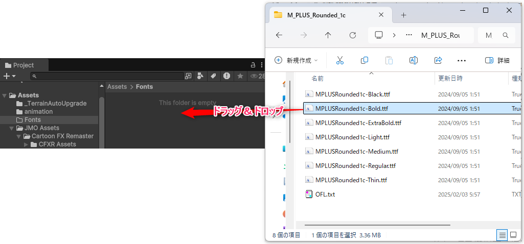 ダウンロードしたフォントをUnityのアセットに入れます。Fontsフォルダなど作っておくとわかりやすいと思います。