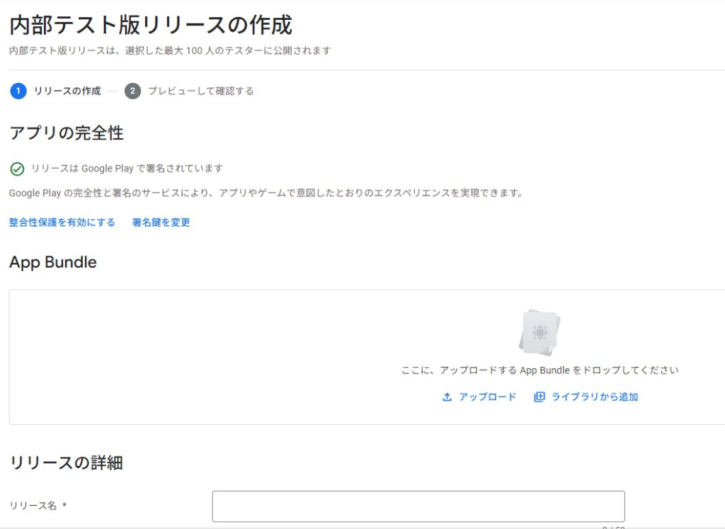 App Bundleのアップロードにリリースするアプリをセットしますが、これはapkファイルではなくaabファイルというリリース用のふぁいるになります。