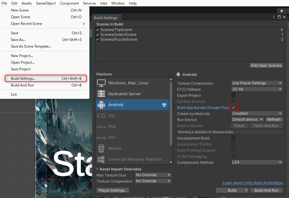 「File」->「Build Settings」->「Build App Bundle (Google Play)」を有効にし、Buildすればaabファイルが出力されます。