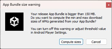 Do you want to compute the min and max download sizes of APKs generated from your App Bundle?You can turn off this warning or adjust threshold value in Android Player Settings.