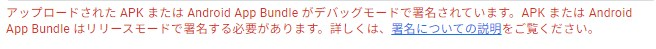 アップロードされた APK または Android App Bundle がデバッグモードで署名されています。APK または Android App Bundle はリリースモードで署名する必要があります。詳しくは、署名についての説明をご覧ください。