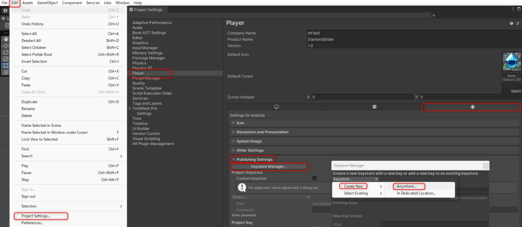「Edit」->「Project Settings」->「Player」->「Android」->「Publishing Settings」->「Keystore Manager」->「Create New」->「AnyWhere」