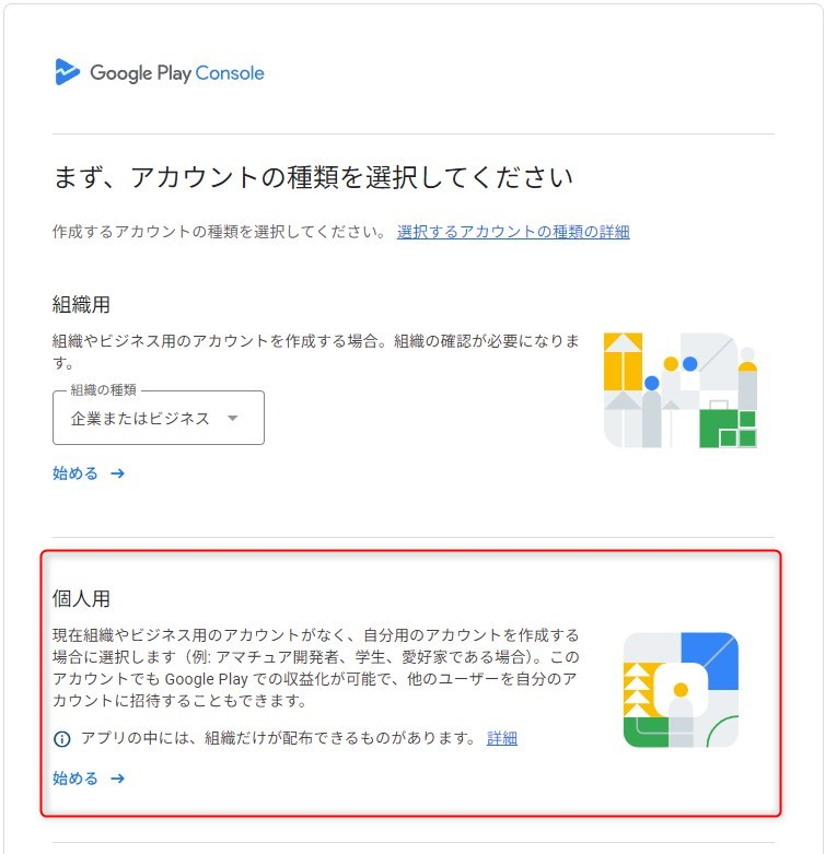 初めてのログインの場合、以下の画面がでます。今回は個人での登録をしようと思っているので個人用で始めます。