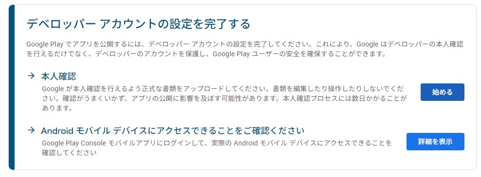 2023 年 11 月 13 日以降に個人アカウントを作成したデベロッパーは、Google Play でアプリを公開して配信する前に、テスト要件に沿ってアプリをテストする必要があります。デベロッパーがこれらの要件を満たすまでは、Google Play Console の一部の機能、たとえば製品版(リリース >製品版)や事前登録(リリース >テスト >事前登録)は無効化された状態になります。