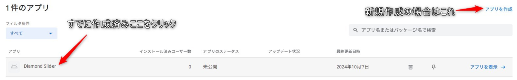 Consoleトップ画面の下部にアプリを作成新しいリリース用のページが作成されます。