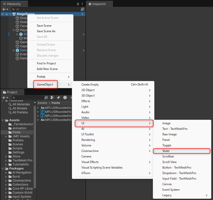 UIのスライダーを追加する。Canvasが作成されない場合は、先にCanvasを作成してください。