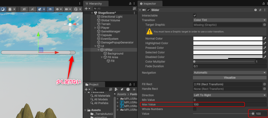 これでSliderの値(Value)を変えることで体力ゲージを増やしたり減らしたりできます。
