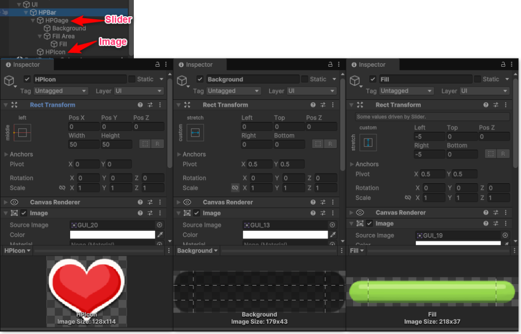 canvasの名前をUIにします。Sliderの名前をHPBarにします。