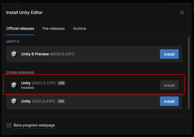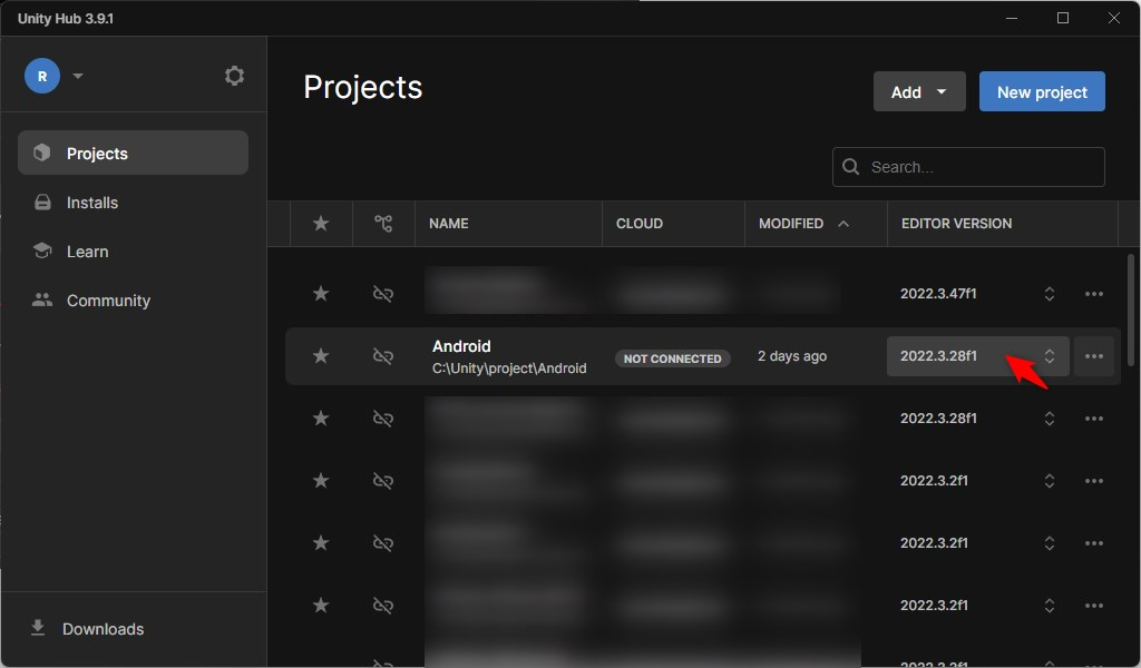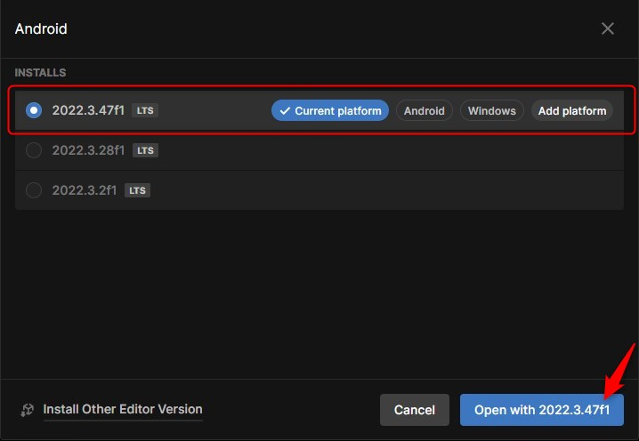 「2022.3.47f1」を選択し、「Open with 2022.3.47f1」をクリックするとProjectの更新が始まります。